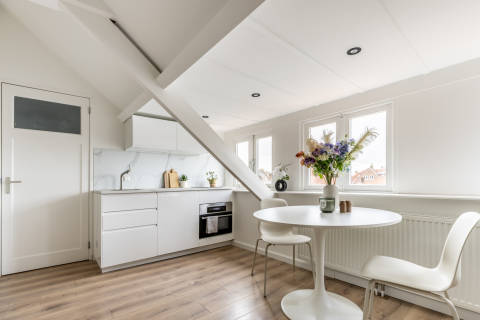 Binnen stap je in een lichte woonkamer met handige bergkast en een open keuken, uitgerust met een gasfornuis, afzuigkap en aansluiting voor een vaatwasser. De moderne badkamer is netjes afgewerkt en voorzien van een douche, wastafelmeubel, handdoekenradiator én plek voor de wasmachine. De slaapkamer is voorzien van twee ramen.